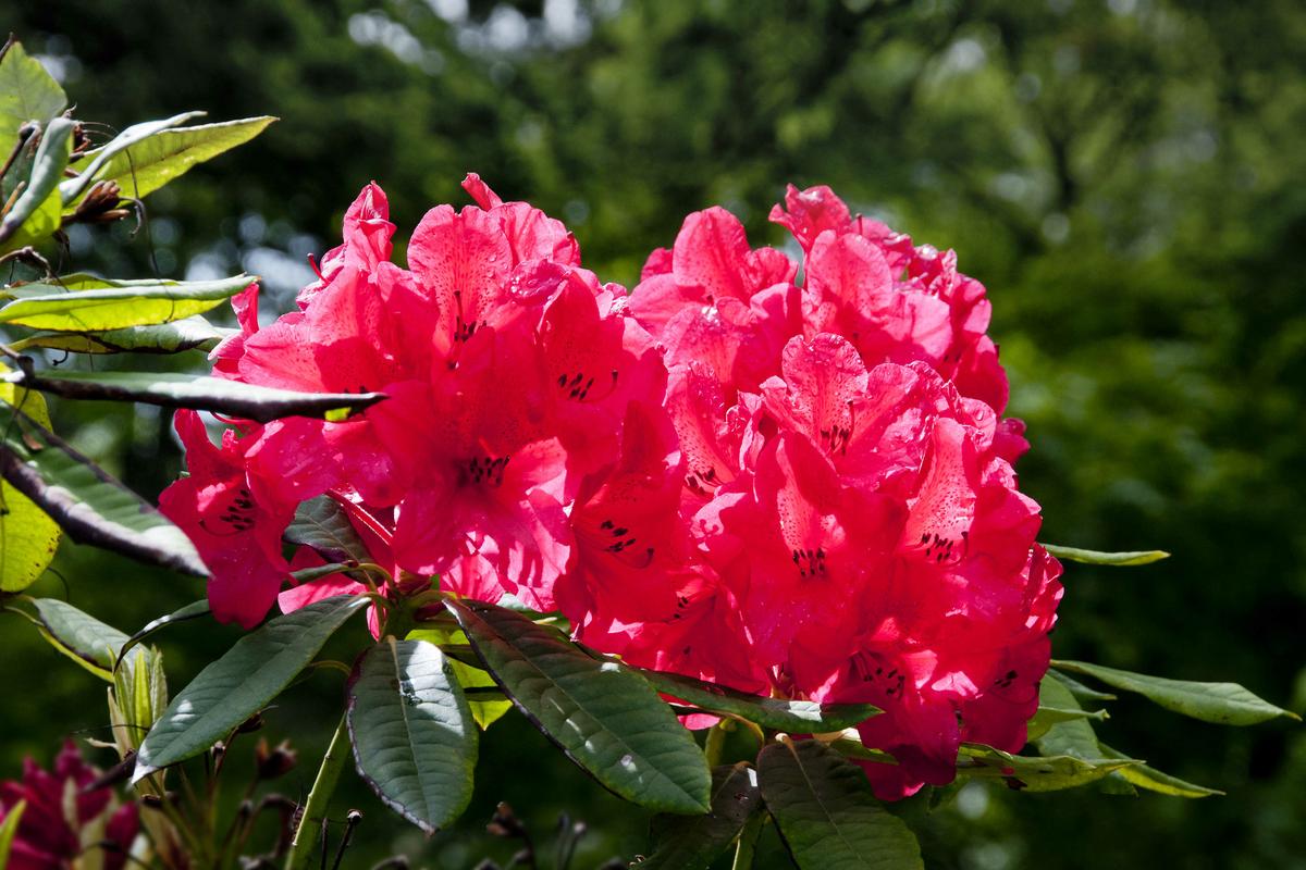 This contrasted dramatically with our next visit to Sherborne Castle, originally the home of Sir Walter Raleigh. The 50 acre lake and sweeping ‘Capability Brown’ landscape provide a glorious setting for the castle and its more formal gardens which include magnificent ginkgo trees. The walk around the lake revealed other champion trees, shrub planting, a wisteria hung bridge, a cascade, the ruins of the original medieval castle and wonderful views over lake and countryside. Late spring is the time for rhododendrons, azaleas, camellias and magnolias. These came in abundance in the amazing garden at Minterne that according to its owner was probably the best it had been for many years. A deep valley with a stream and cascades was so crammed with colour and variety that it felt like a jungle in the afternoon heat. The many wonderful and rare trees and shrubs come from plant-hunting expeditions to the Himalayas. The jungle theme continued with even greater effect at Abbotsbury where a mild micro-climate by the sea allows rare and tender plants to grow. Towering trees provide protective cover for a vast collection of rhododendrons, azaleas, palm trees, bamboos, a Mediterranean bank garden, a stream with lily ponds, and giant gunnera plantings taller than a person. A steep climb to the edge of the garden revealed a breathtaking view of Chesil Beach.